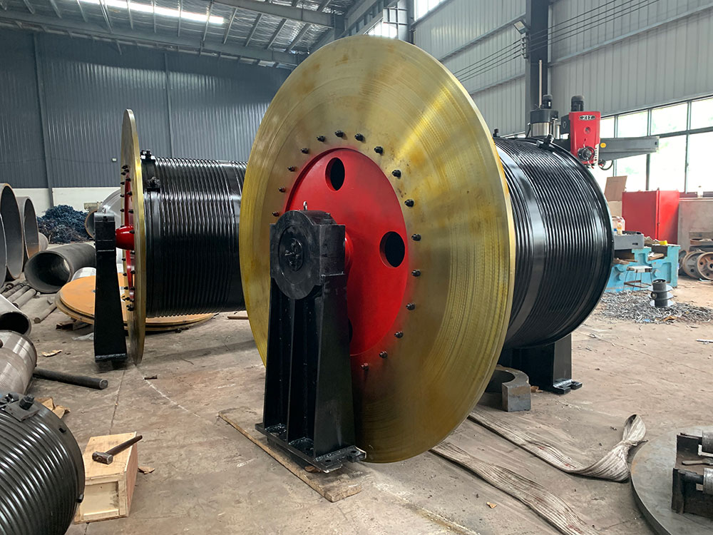 如果起升高度較大的時候,為了縮小卷筒的尺寸,可采用表面帶導(dǎo)向螺旋槽或光滑的卷筒進(jìn)行多層卷繞,但鋼絲繩磨損較快,適用于慢速和工作類型較輕,噸位較低的起重機(jī)。鋼板卷筒組則主要適用于大噸位、性能要求高的起重機(jī)械設(shè)備。